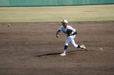 7対2のままいよいよ最終回の攻防へ。明善は先頭打者の下川君が四球で出塁。